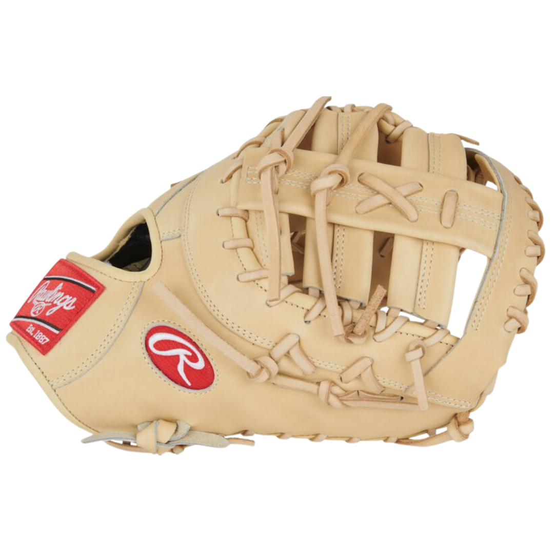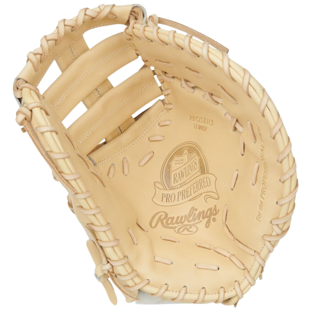 Anchor your infield with the Rawlings Pro Preferred 13-Inch First Base Mitt, the same game-day model trusted by Bryce Harper. Featuring a clean Camel colorway and classic red patch branding, this mitt brings big-league confidence to your game.